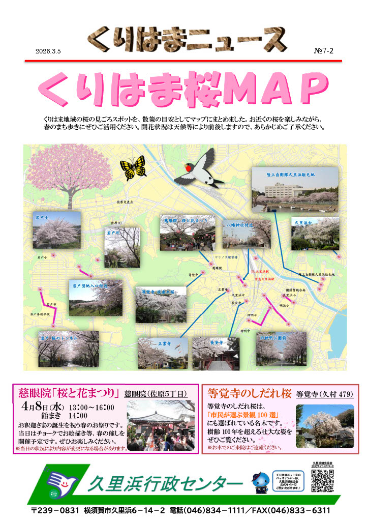 2026/3/下旬~4/上旬MAP参照久里浜周辺には桜並木や桜の名所がたくさんあります。慈眼院では「桜と花まつり」も開催されます。※今年は久里浜駐屯地「桜まつり」の開催はありません。